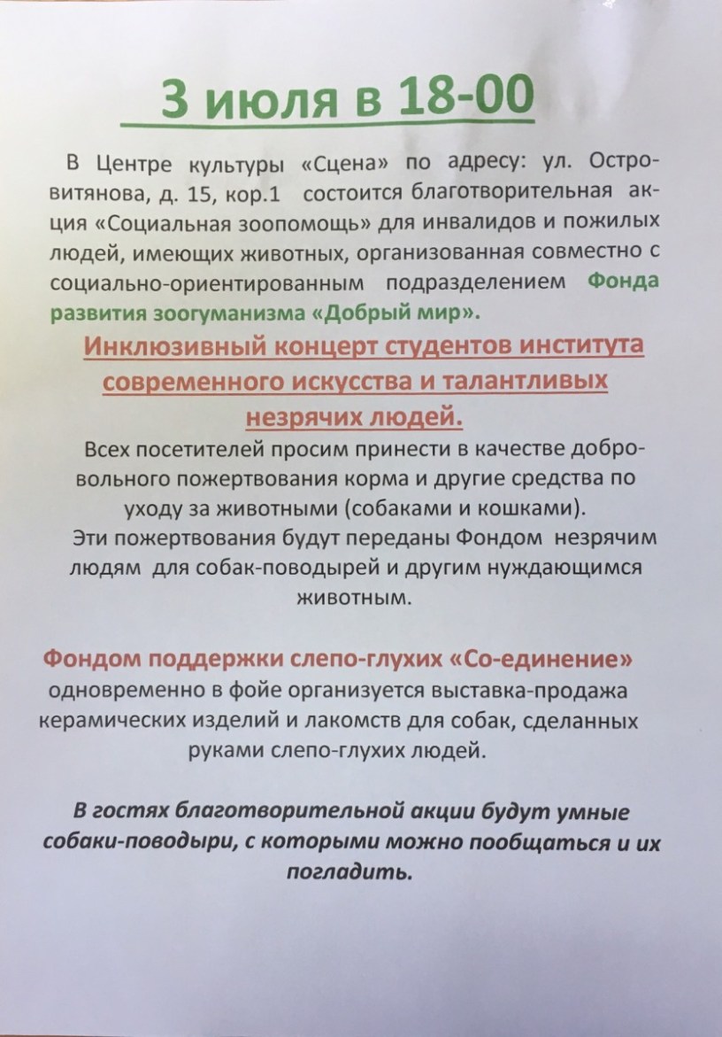 Добрые люди из Департамента культуры Москвы и государственного бюджетного учреждения «Центр культуры «Сцена» безвозмездно предоставили нам возможность провести благотворительный концерт в театре-студии «Откровение» :