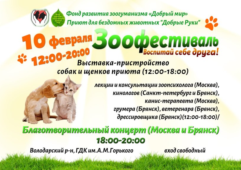 Вопреки «Празднику Смерти» , устроенному Министерством спорта в городах, принимающих Чемпионат мира по футболу 2018, зоогуманисты из ФРЗ «Добрый Мир» совместно с приютом «Добрые руки» устроили в Брянске «Праздник жизни» под названием «Зоофестиваль воспитай себе друга».