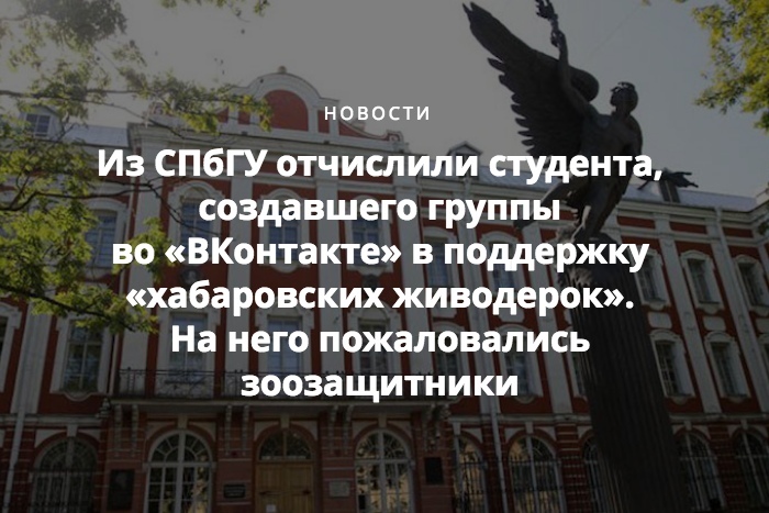Санкт-Петербургский государственный университет отчислил студента философского факультета Антона Приживого. Ранее «Фонтанка» писала, что молодой человек создал группы поддержки осужденных хабаровских живодерок и помогал их родственникам собирать деньги на адвокатов.