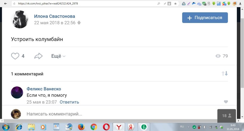 Кроме этого я показал сыщикам скрин-шоты опубликованные в материале «Боевики Навального готовят масштабный теракт в Университете !?» , которые однозначно свидетельствуют о наличии планов устроить бойню в учебном заведении :