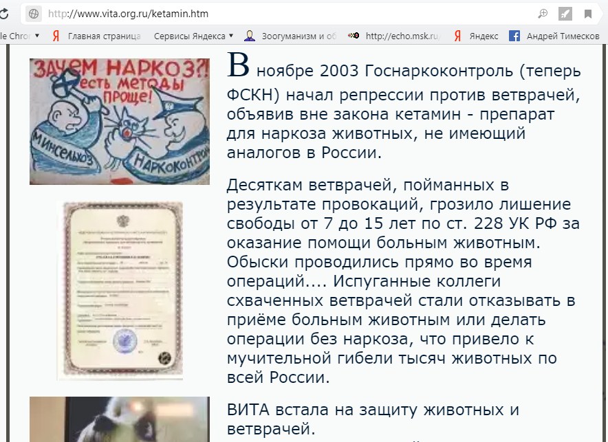 в 2003 году «Вита» заявила, что Кетамин, якобы, запретили для применения в ветеринарии и теперь российские ветврачи вынуждены делать операции без наркоза, что привело к мучительной гибели тысяч животных по всей России.