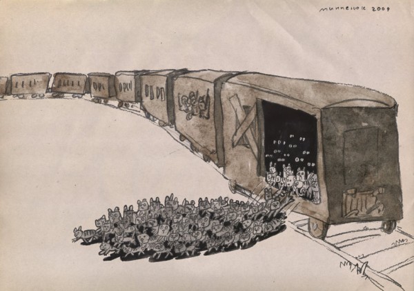 «Весть о том, что сегодня в город доставят кошек, мгновенно облетела всех. Люди огромными толпами собрались на вокзале, возникла ужасная давка. Многие на перрон пришли целыми группами (в основном, это были семьи или соседи) и пытались рассредоточиться по всей его длине. Рассчитывали на то, что хотя бы одному из группы удастся взять кошку…»