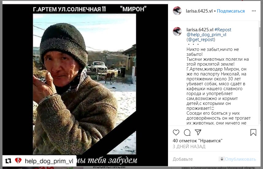 Некто, именующий себя «Мирон», якобы, постоянно покупает домашних и бездомных собак , после чего разделывает их на мясо, которое продает в рестораны и кафе города Владивостока и окрестностей , — сообщает Instagram-сообщество в help_dog_prim_vl ( см. видео ) .