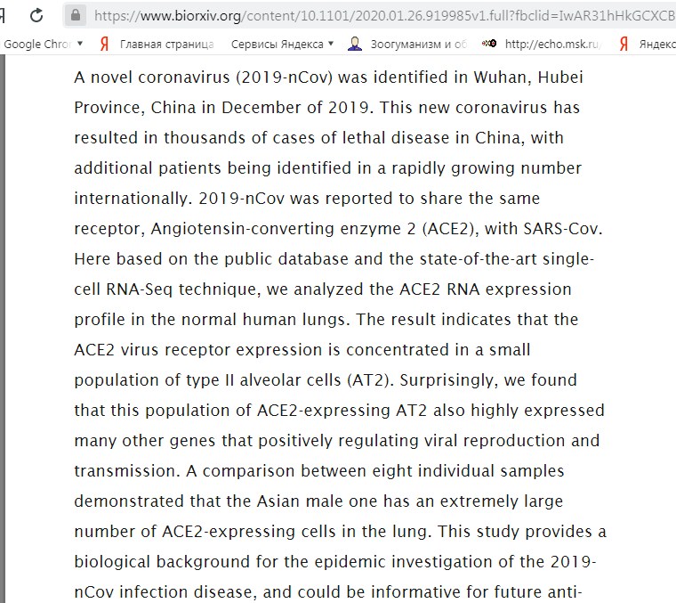 » … the ACE2 virus receptor expression is concentrated in a small population of type II alveolar cells (AT2). Surprisingly, we found that this population of ACE2-expressing AT2 also highly expressed many other genes that positively regulating viral reproduction and transmission. A comparison between eight individual samples demonstrated that the Asian male one has an extremely large number of ACE2-expressing cells in the lung…»