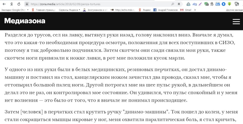 » …У одного из них руки были в белых медицинских, резиновых перчатках, он достал динамо-машину и поставил на стол, канцелярским ножом зачистил два провода, сказал мне, чтобы я оттопырил большой палец ноги. Другой потрогал мне на шее пульс рукой, в дальнейшем он делал это не раз, он контролировал мое состояние. Он удивился, что пульс спокойный и у меня нет волнения — это было от того, что я вначале не понимал происходящее.Затем [человек] в перчатках стал крутить ручку «динамо-машины». Ток пошел до колен, у меня стали сокращаться мышцы икровые у ног, меня охватила паралитическая боль, я стал кричать…»