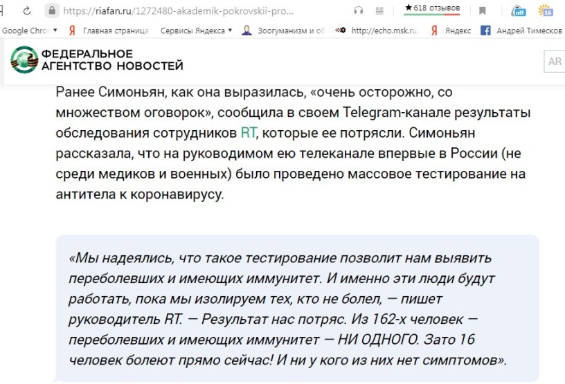 Одновременно с этим Главный редактор изданий «Раша Тудей» и «Спутник» Маргарита Симоньян выбросила в свой Телеграм-канал почти панический пост о результатах скрининг-теста на антитела к COVID-19 для своих работников, которых проанализировали всех поголовно :