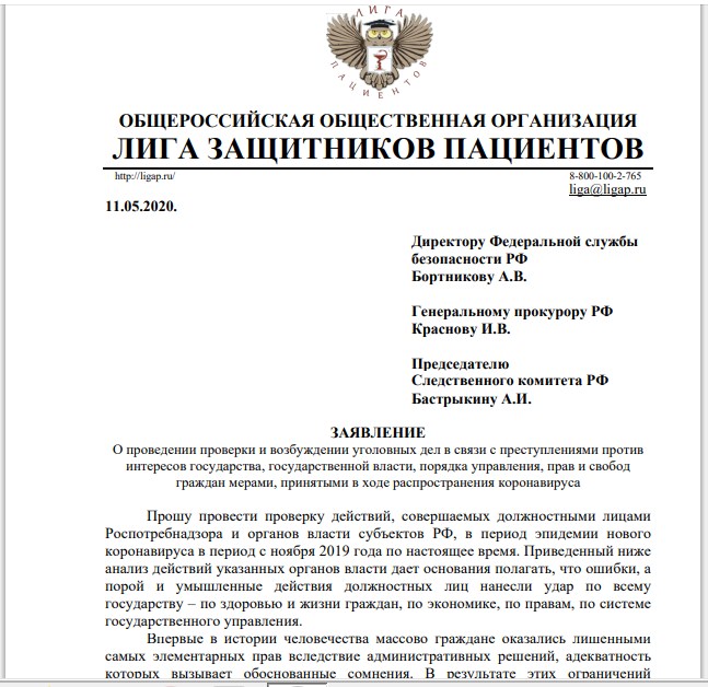 Лига защиты прав пациентов 11 мая отправила Обращение в ГенПрокуратуру, ФСБ, СК РФ о нарушениях прав граждан в ходе борьбы с пандемией, в котором просит проверить действия мэра Москвы, глав других регионов, а также СМИ и Роспотребгадзора на предмет наличия в них составов преступления по ст. 207.1, 207.2 УК РФ.