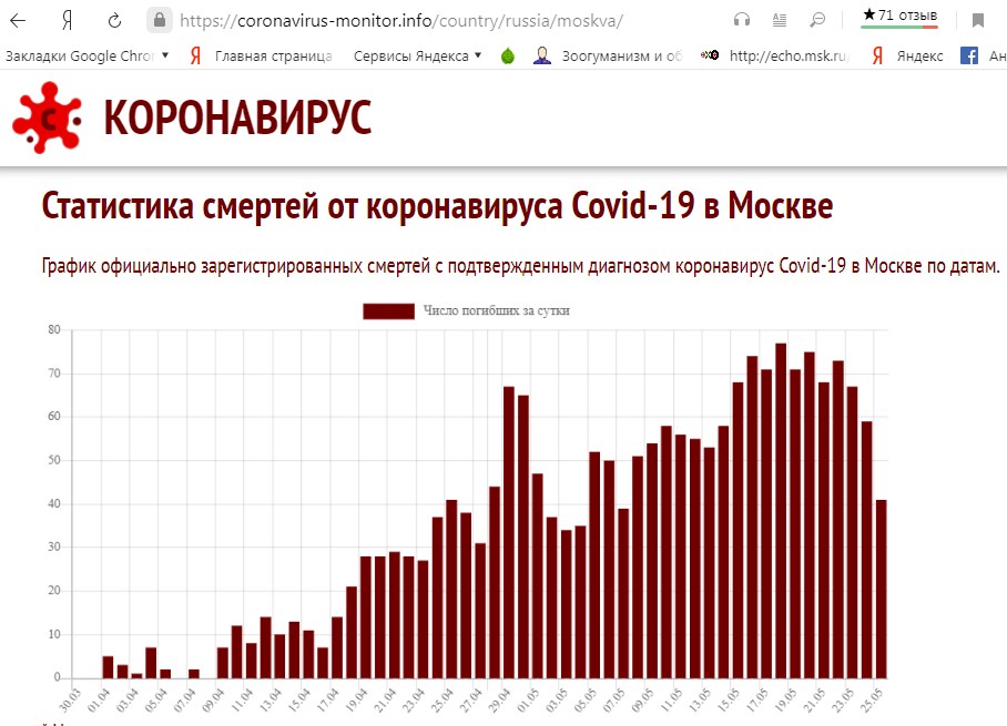 Это означает, что только в Москве число переболевших COVID-19 может быть более 1.5 миллионов, из которых, по официальным данным, на 25 мая умерло 2034 человека с подтвержденным ковидным диагнозом .