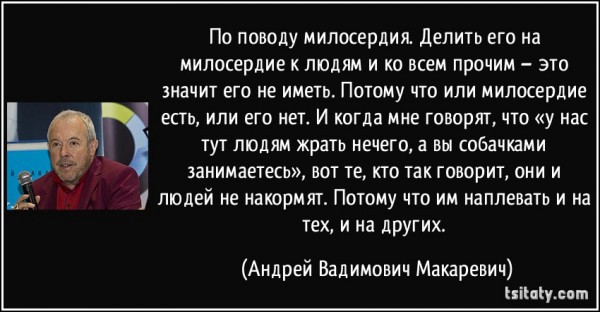 „По поводу милосердия. Делить его на милосердие к людям и ко всем прочим – это значит его не иметь. Потому что или милосердие есть, или его нет. И когда мне говорят, что «у нас тут людям жрать нечего, а вы собачками занимаетесь», вот те, кто так говорит, они и людей не накормят. Потому что им наплевать и на тех, и на других.“