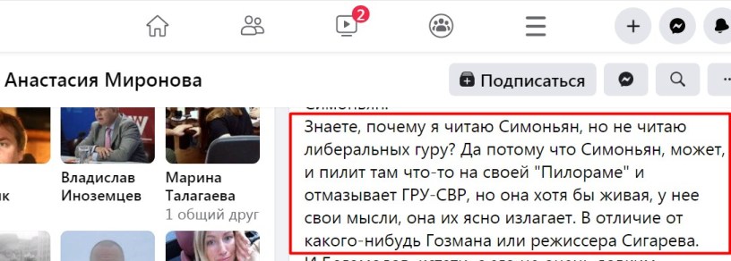 Бывшая звезда «Новой Газеты» и «Эха Москвы» на своей странице в Фейсбуке открыто поёт дифирамбы Маргарите Симоньян . https://www.facebook.com/ns.mironowa/posts/5106123599462941